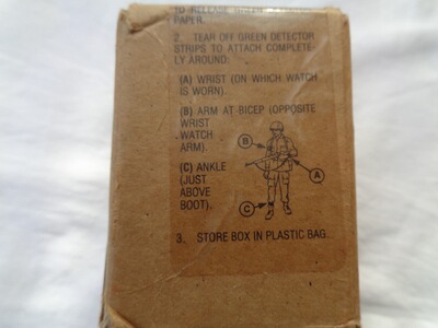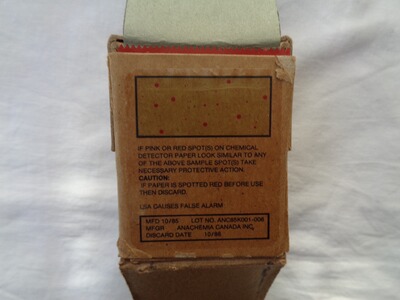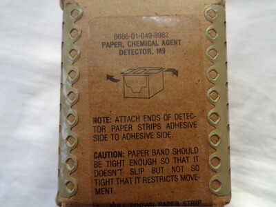 Das M9 Detection Paper wird am Körper befestigt und zeigt Kontakt mit chemischen Kampfstoffen, die Verpackung/Transportbox ist geöffnet von der Rolle fehlt aber kaum etwas. Datiert Oktober 1985.