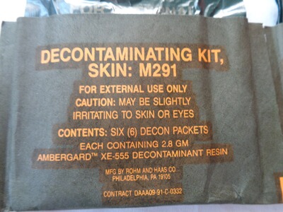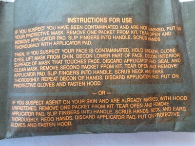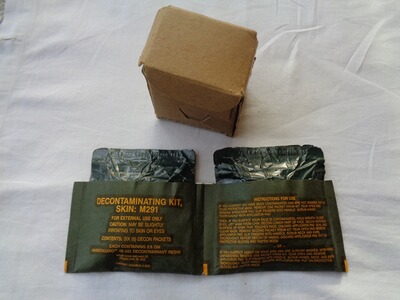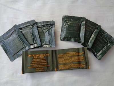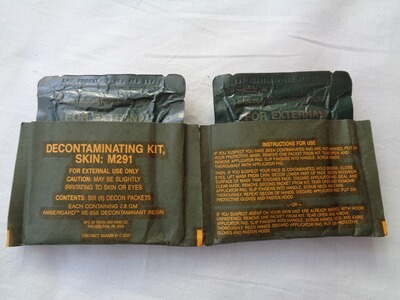 Der M291 ABC Dekontaminations Kit diente zur Dekontamination von betroffenen Hautpartien. Er besteht aus zwei gleichen Teilen mit jeweils 3 Stück Dekonttüchern eingeschweißt in stabile Folie. Datiert November 1991. Unbenutzt/neu (NOS)
