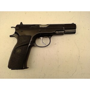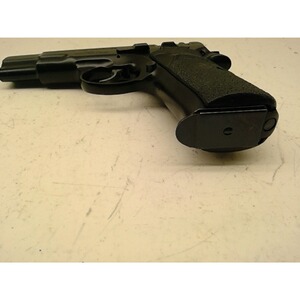 klassische Ganzstahlpistole mit Beschuß von 1990. Es handelt sich um die Tropenausführung mit mattschwarzer rostresistenter Polymerbeschichtung.Starre Visierung, SA/DA Abzug, Browning/FN Verschluß. Nachträglich angebrachte Pachmayr Gummi Griffschalen mit angedeuteter Daumenauflage