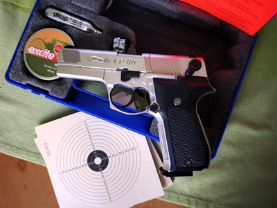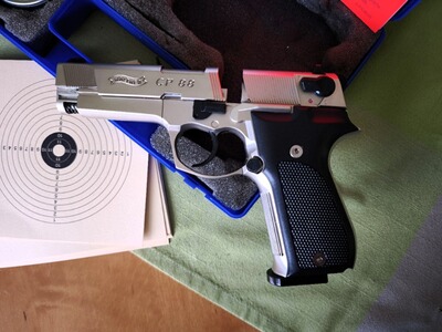 aus Sammlungsverkleinerung biete ich eine schöne gepflegte Walther CP 88 Co2-Pistole im Nickel-Finish mit Zubehör an.