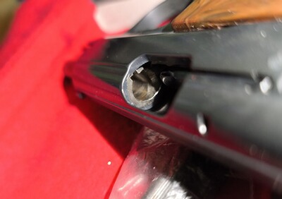 Die kleine Laufsperre liegt sehr weit zurück und ist praktisch nicht erkennbar - die vielen Stahlteile und die kleine Laufsperre sind bei heutigen Signal-/Schreckschusswaffen undenkbar.