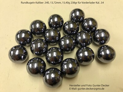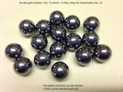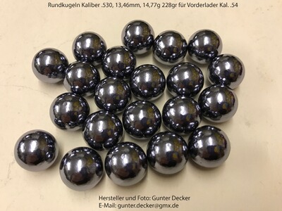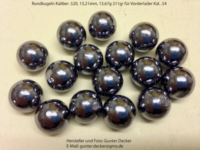 Biete Rundkugeln im Kaliber .520 13,21mm, Kal. .530 13,46mm, Kal. .535 13,60mm sowie Kal. .540 13,72mm für Vorderlader Gewehre Pistolen Kal. .54 zum Kauf an.