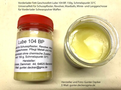 Zum Fetten der Schußpflaster ist das von mir entwickelte Vorderladerfett, das Lube 104 BP gut geeignet. Es hat einen Schmelzpunkt von 33°C und ist damit ganzjährig einsetzbar. Mehr Details zu meinen Vorderlader Fetten sind bei den Auktionen hier auf Auctronia zu finden.
