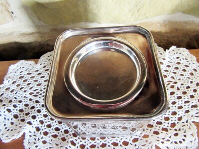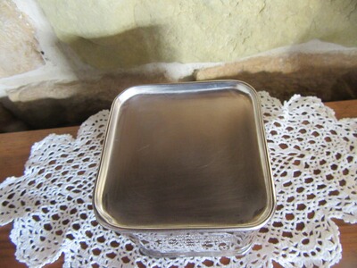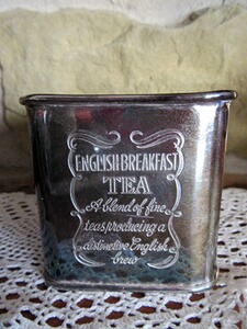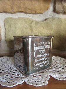 Kleine, rechteckige, silberfarbene im englischen Stil gehaltene Vintage Teedose. Es handelt sich hierbei um einen sehr dekorative Nachbau. Zu dem Herstellungszeitraum kann man wenig sagen, da diese Dosen schon seit den 90er auf dem Markt sind.