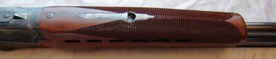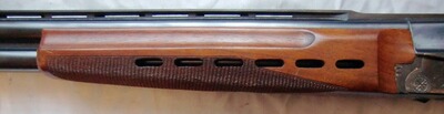 Schön gemaserter, gerader Holzschaft ohne Backe mit, Pistolengriff, ganz leichte Schränkung für Rechtsschützen, Pistolengriff und Vorderschaft mit scharf geschnittener deutscher Fischhaut, ventilierte Gummischaftkappe. Vorderschaft mit Lüftungsschlitzen zur schnelleren Wärmeableitung.