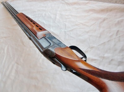 Kal. 12/70, hochglanzbrüniert, Einabzug mit mech. Umschaltung, ventilierte 11mm Laufschiene, Sicherungsschieber auf dem Kolbenhals, buntgehärtete Stahlbasküle mit dezenter Rankengravur, Perlkorn sowie Hilfskorn, mit Ejektoren, stabile Laufhakenverriegelung.