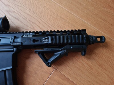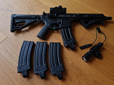 Die Ares Amoeba Octarms M4-KM6. Es handelt sich um eine S-AEG-Version des Modells M4-KM6 und wird mit vier Begadi 190 Schuss Midcap Magazinen angeboten. Dieses Modell ist im guten Zustand, nachdem es bereits zwei Einsätze erfahren hat.