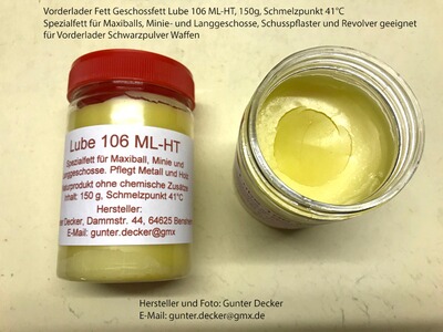 Zum Fetten der Minie Geschosse sind die von mir entwickleten Vorderlader Fette, das Lube 105 ML-LT, das Lube 104 BP sowie das Lube 106 ML-HT gut geeignet. Die Fette habe unterschiedliche Schmelzpunkte und daher für die unterschiedlichen Bediungungen einsetzbar. Details bitte bei der Angebot zu dem Lube 105 ML-LT, dem Lube 104 BP und den Lube 106 ML-HT hier auf Auctronia nachlesen.
