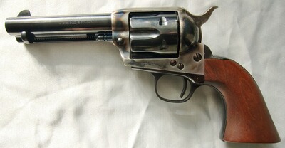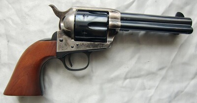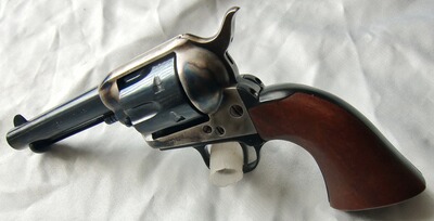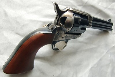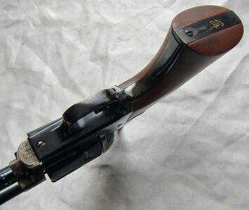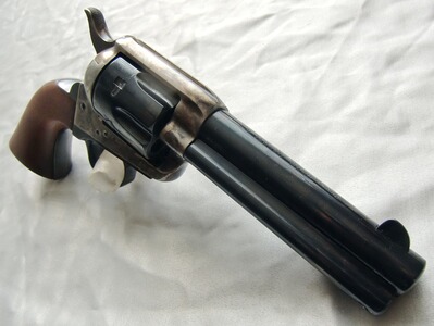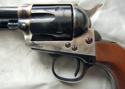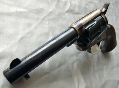 Sehr guter Zustand mit nur leichten Gebrauchsspuren. Brünierung/Bunthärtung ca. 99% - also nahezu vollständig erhalten! Kaum Laufspuren an der Trommel von der Klinke, kein Rost, keine Magnumrille. Der Lauf ist blank, Züge und Felder scharfkantig, gutes Abzugsverhalten. Scheint wenig geschossen bzw. geholstert worden zu sein, einwandfreie Funktion auf dem Schießstand. Top Westernwaffe!